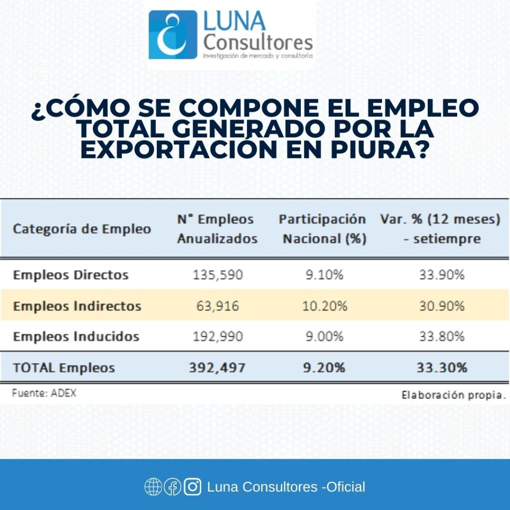 ¡Piura en el Top del empleo por exportación peruana! El reciente informe de la Asociación de Exportadores (ADEX)nos ofrece cifras del impacto de la exportación en el empleo de nuestra región.