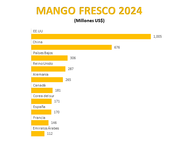 Estados Unidos es el mayor importador mundial de mango fresco, por un valor importado de US$ 1,005 millones, y un volumen importado de 575 mil 858 toneladas en 2024. La demanda es alta durante todo el año debido a la limitada producción local, por lo que depende de importaciones provenientes principalmente de México, Perú, Ecuador y Brasil.