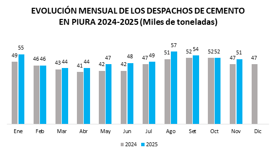 Durante 2024, los despachos de cemento en Piura fueron menores en la mayoría de los meses. Este comportamiento estuvo asociado principalmente a una menor ejecución de la inversión pública, retrasos en el inicio y avance de obras, paralizaciones de proyectos de infraestructura y un contexto de mayor cautela por parte del sector privado, factores que limitaron la demanda de insumos para la construcción.